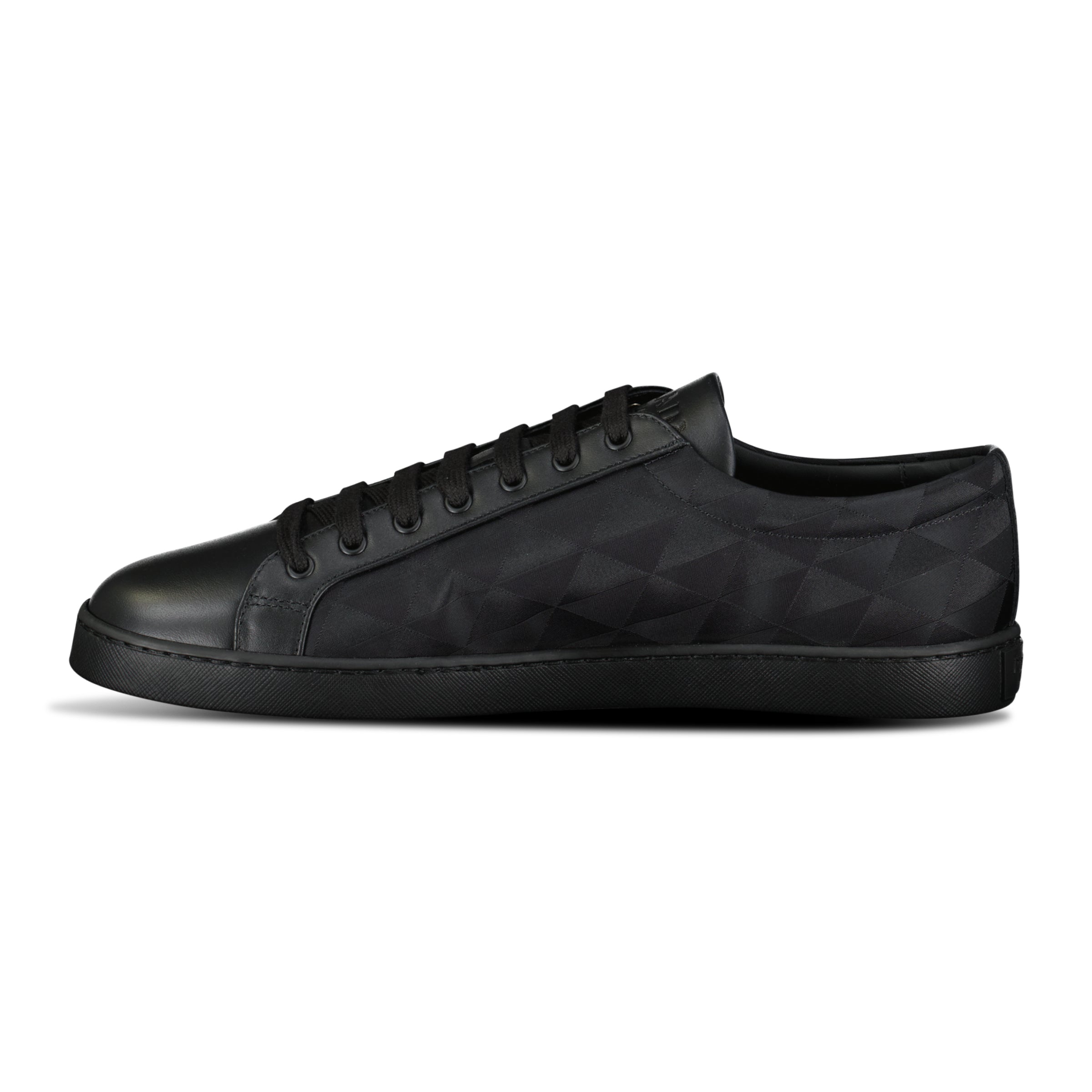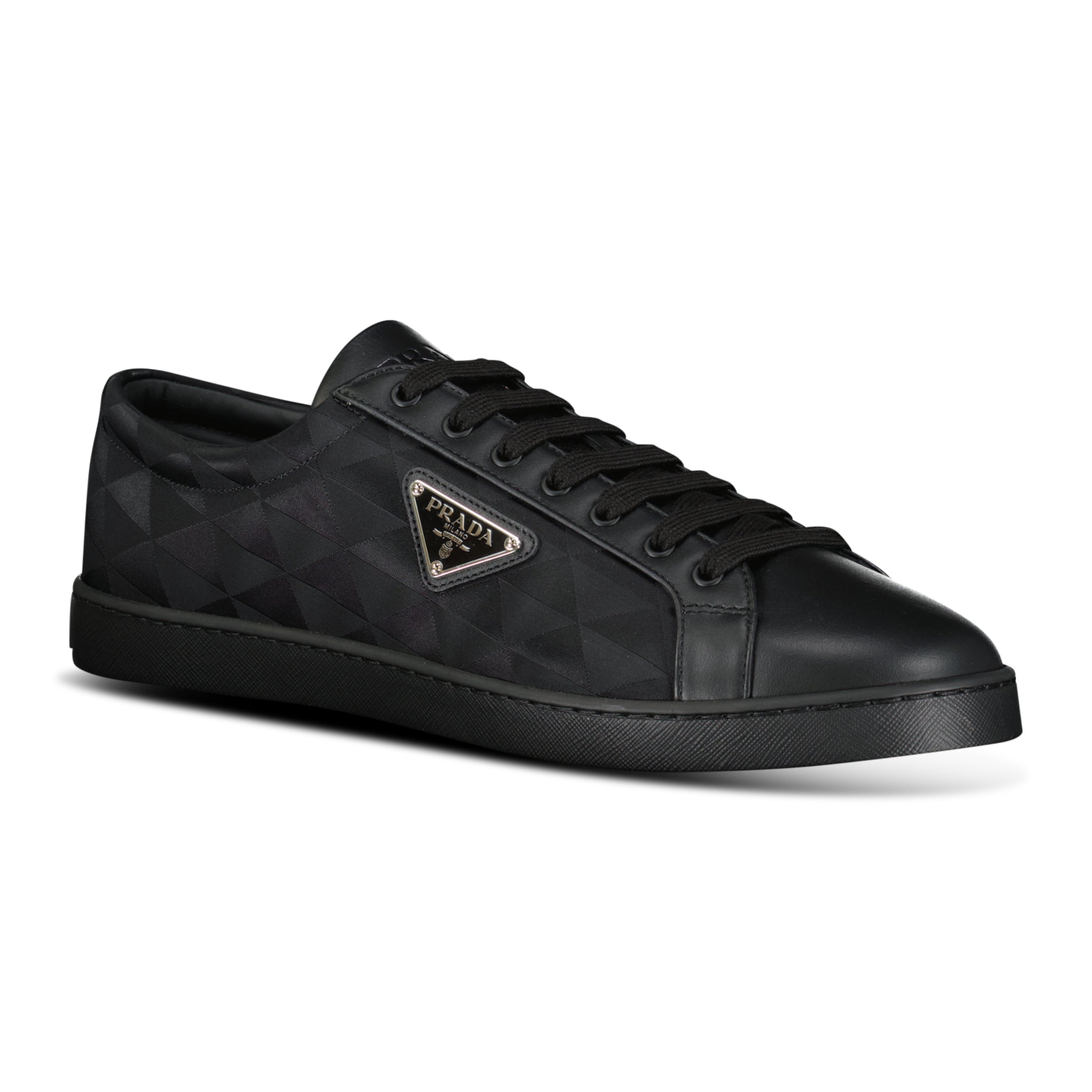 Designed with a sleek low profile silhouette, they feature the iconic Prada enamel triangle logo, cushioned rubber sole, and lace up fastening for all day wear. The versatile black colourway makes them ideal for everyday styling, whether paired with casual denim or elevated streetwear looks.