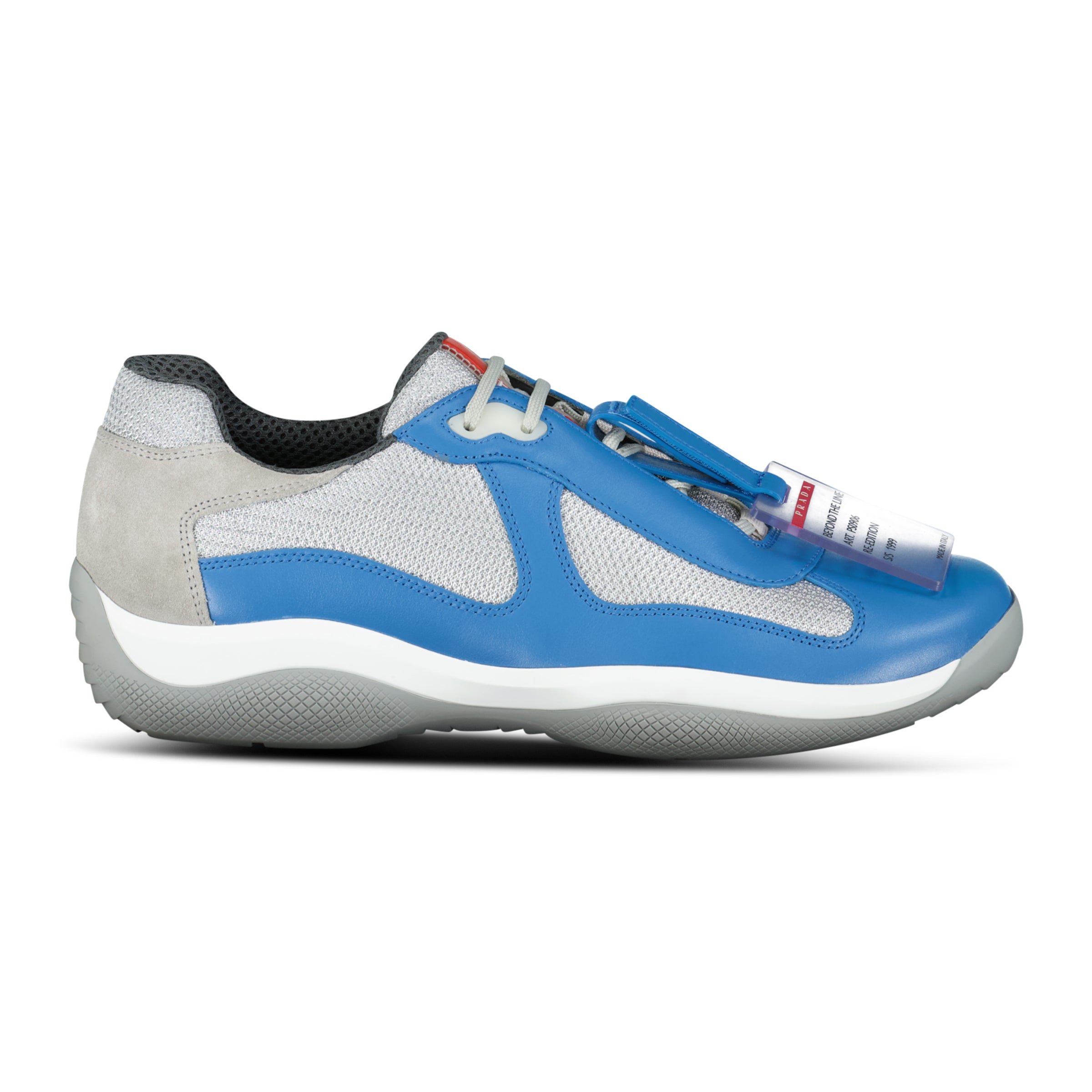 Step into iconic Italian design with the Prada Americas Cup OG Sneakers in Blue and grey mesh. Originally created for the Luna Rossa sailing team, this legendary silhouette blends luxury craftsmanship with performance inspired detailing. The clean white body paired with subtle grey accents offers a fresh versatile look that elevates any wardrobe.